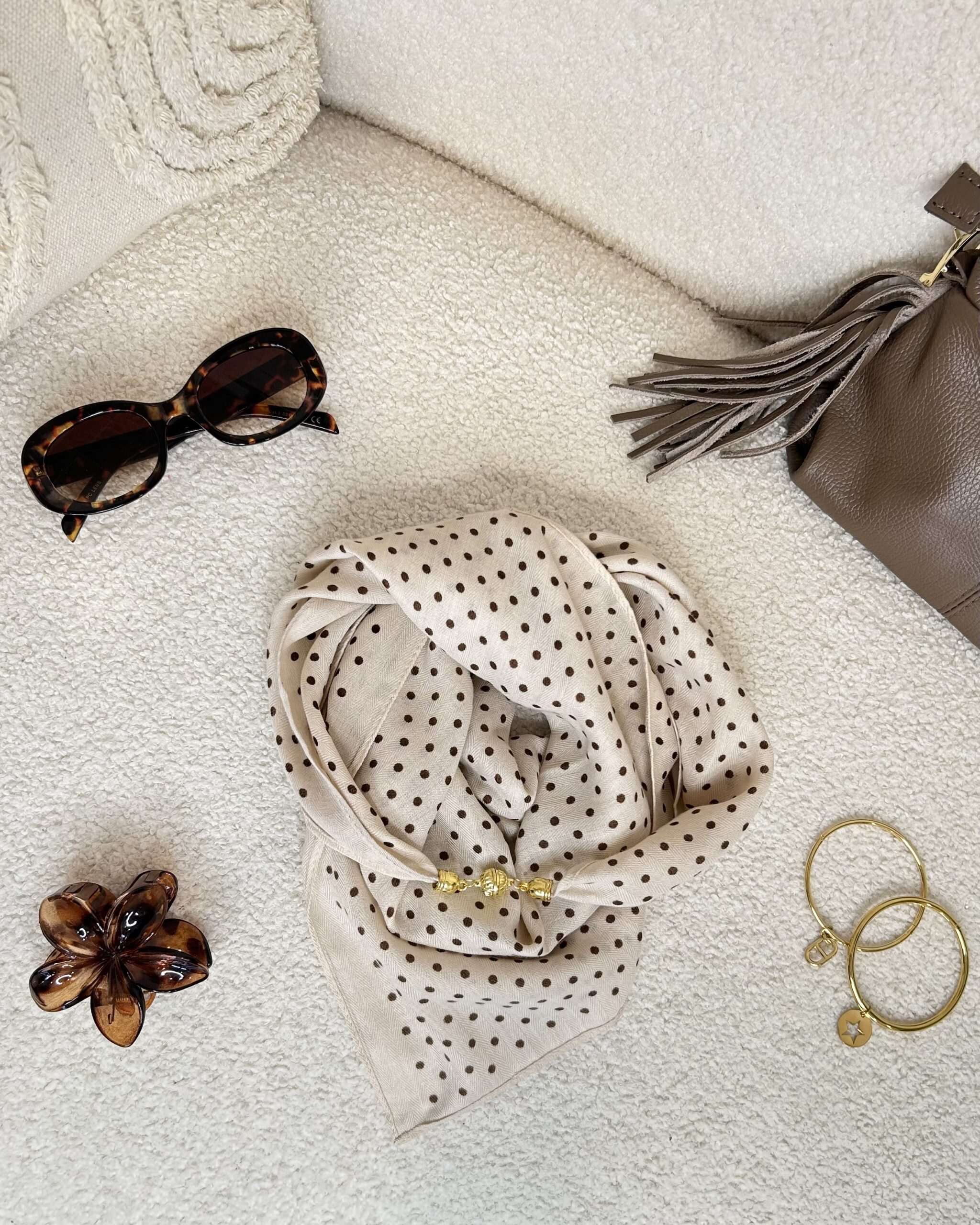 Le foulard à pois est modulable et s’adapte à tous les styles et morphologies grâce à ses formats carré et triangulaire.