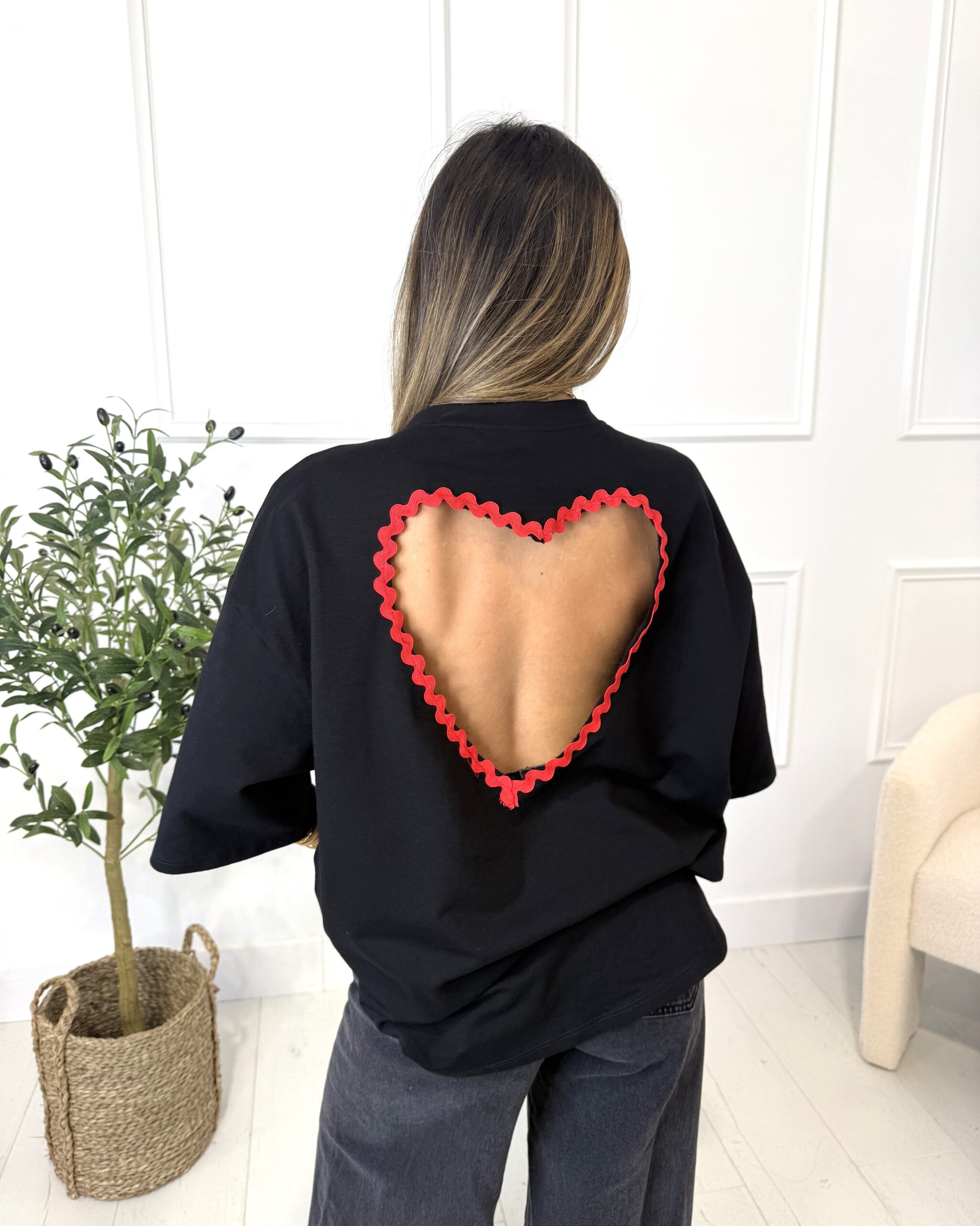 Le T-shirt ROSY combine un col rond classique et des manches larges pour un effet oversize tendance. Mais c’est surtout son dos-nu en forme de cœur qui attire tous les regards. Le contour souligné par un galon rouge apporte une touche romantique et originale, parfaite pour jouer avec le contraste entre simplicité et audace.