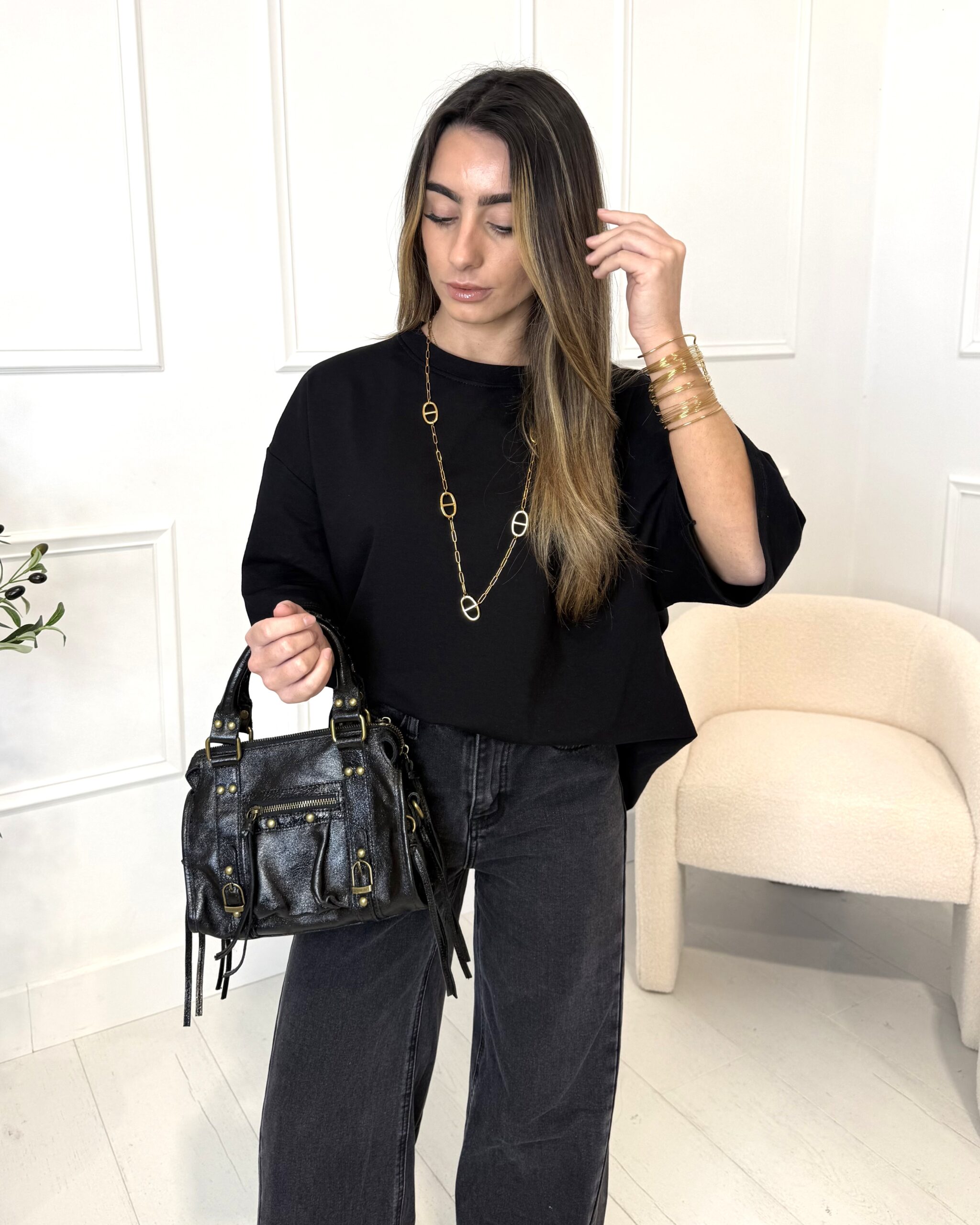Disponible en taille unique, le T-shirt ROSY convient du XS au XL. Sa coupe oversize et sa matière légèrement stretch garantissent un tombé fluide qui flatte toutes les silhouettes, tout en restant confortable et facile à porter.