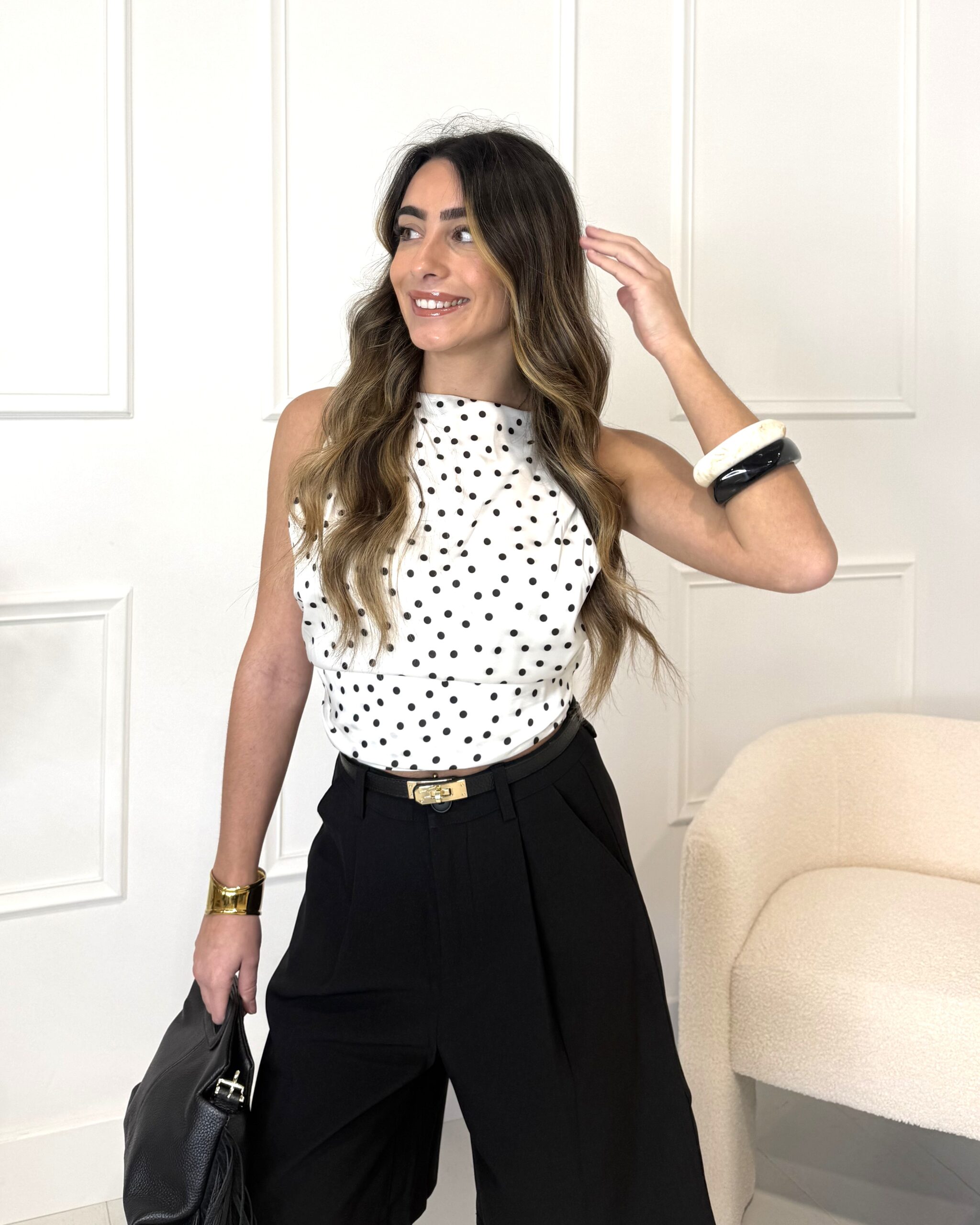 Le Top à pois LUCIE est facile à associer. Par exemple, pour un look casual, porte-le avec un jean taille haute et des baskets.
