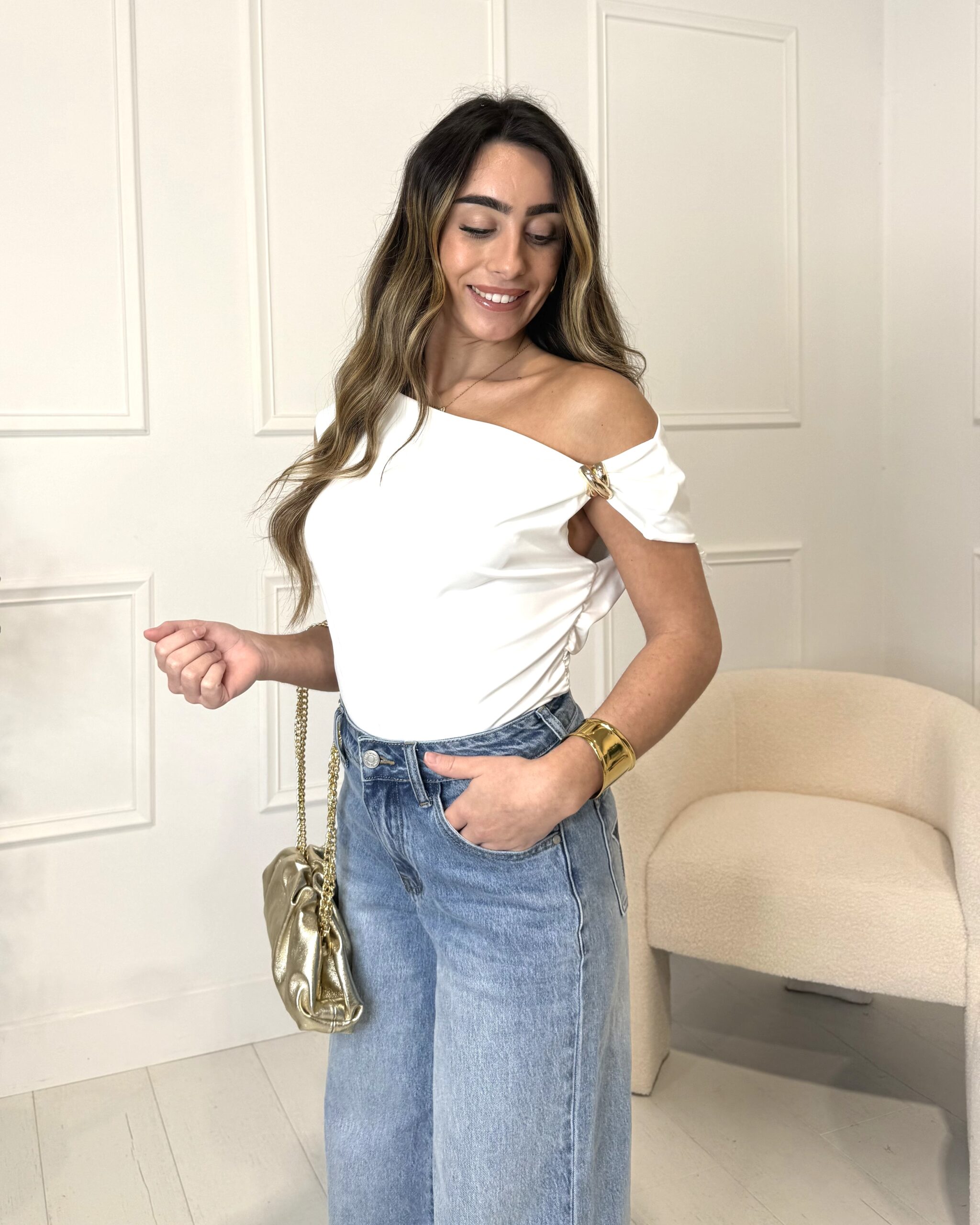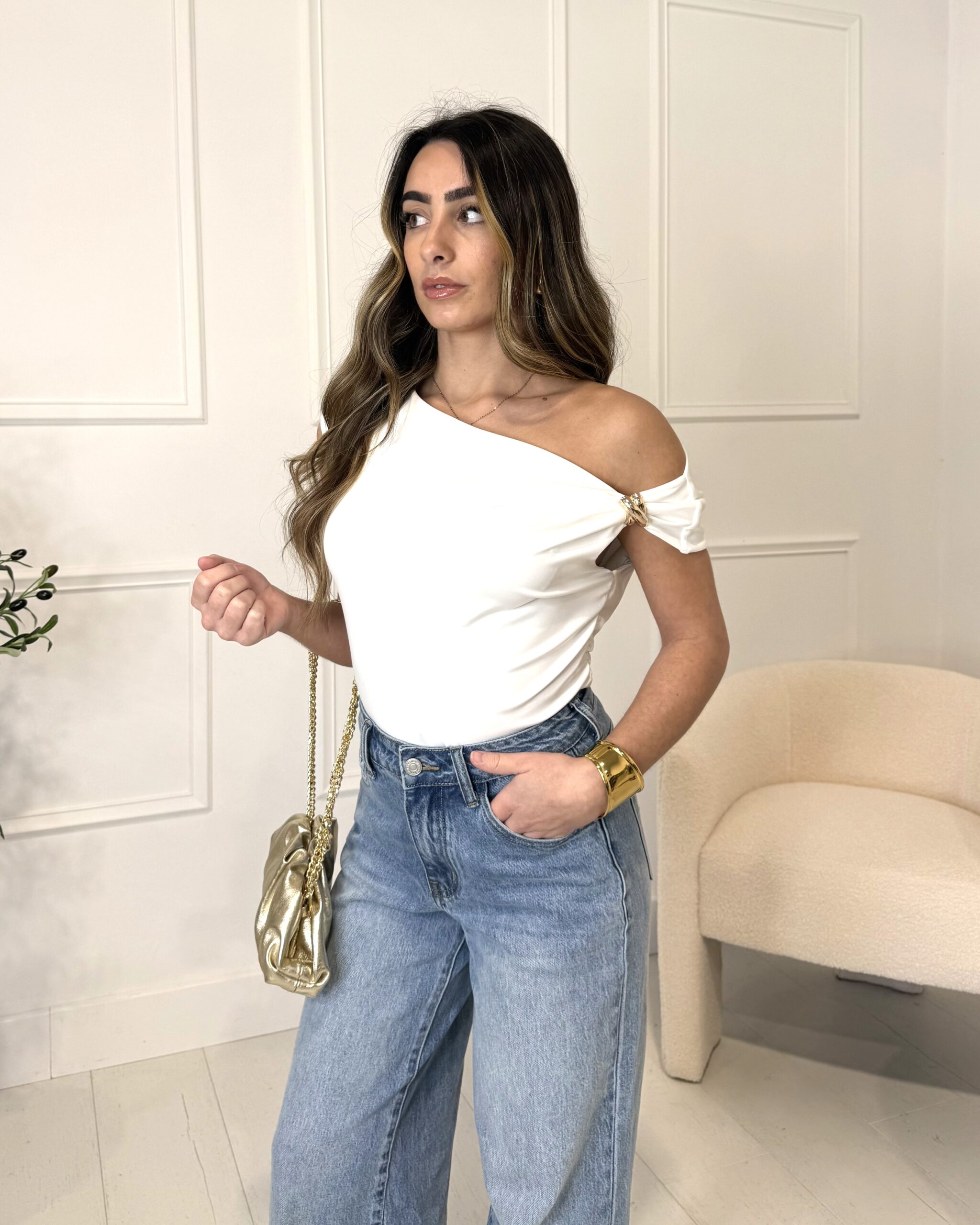 Ce qui rend le top froncé GEMMA irrésistible, ce sont ses détails soigneusement pensés. L’encolure drapée crée un joli jeu de plis qui attire le regard, tandis que les fronces latérales apportent de la dimension et sculptent subtilement la silhouette. En effet, les épaules dégagées mettent en avant une allure élégante et féminine, parfaite pour toutes celles qui aiment se sentir chic sans effort. Le bijou décoratif sur l’épaule est la touche finale qui transforme ce top simple en pièce mode tendance et originale.